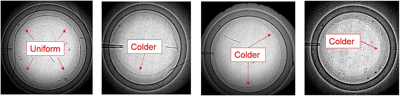 In inertial confinement fusion experiments, fuel quality is determined mainly by the thermal environment of the capsule in the layering procedure. Owing to the absence of a radial thermal gradient, formed deuterium–deuterium (DD) ice shells in the capsule are thermally instable. To obtain a solid DD layer with good quality and long lifetime, stringent demands must be placed on the thermal performance of cryogenic targets. In DD cryogenic target preparation, two issues arise, even after the capsule’s temperature uniformity has been improved by the use of thick aluminized films. The first is the inconsistent ice shape, which is related to the capsule’s thermal field. In this article, some typical fabrication details are investigated, including adhesive penetration during assembly, the presence of the fill tube, the optical properties of the hohlraum and film surfaces, the jacket–hohlraum connection, deviations in capsule location, and asymmetrical contact at the arm–jacket interfaces. Detailed comparisons of the thermal effects of these factors provide guidance for target optimization. The second issue is the instability of seeding crystals in the fill tube due to unsteadiness of the direction of the thermal gradient in the fill tube assembly. An additional thermal controller is proposed, analyzed, and optimized to provide robust controllability of tube temperature. The analysis results and optimization methods presented in this article should not only help in dealing with thermal issues associated with DD cryogenic targets, but also provide important references for engineering design of other cryogenic targets.