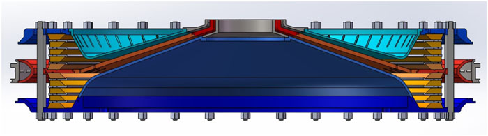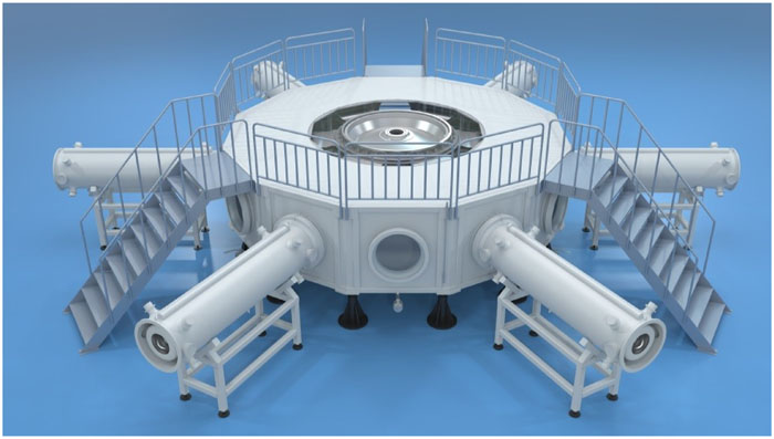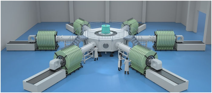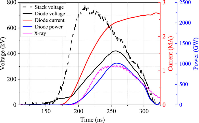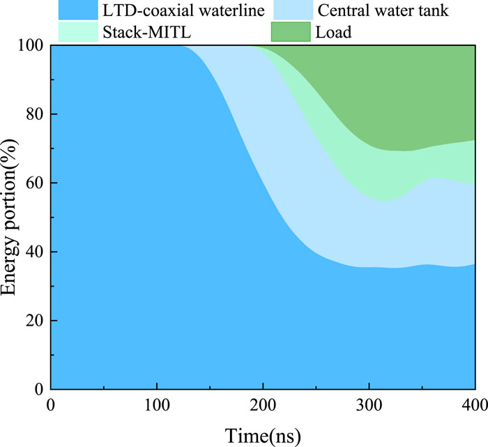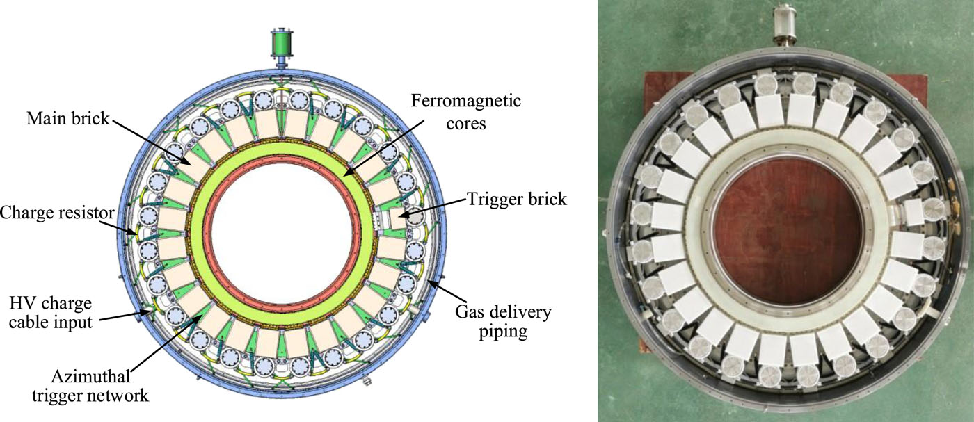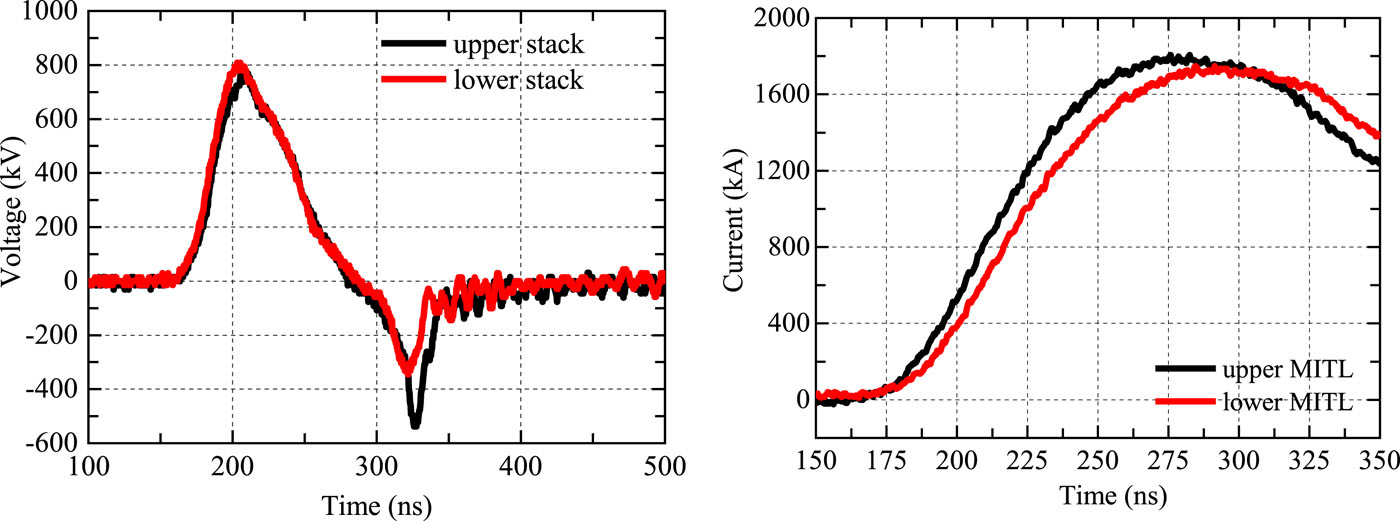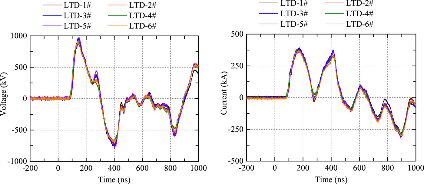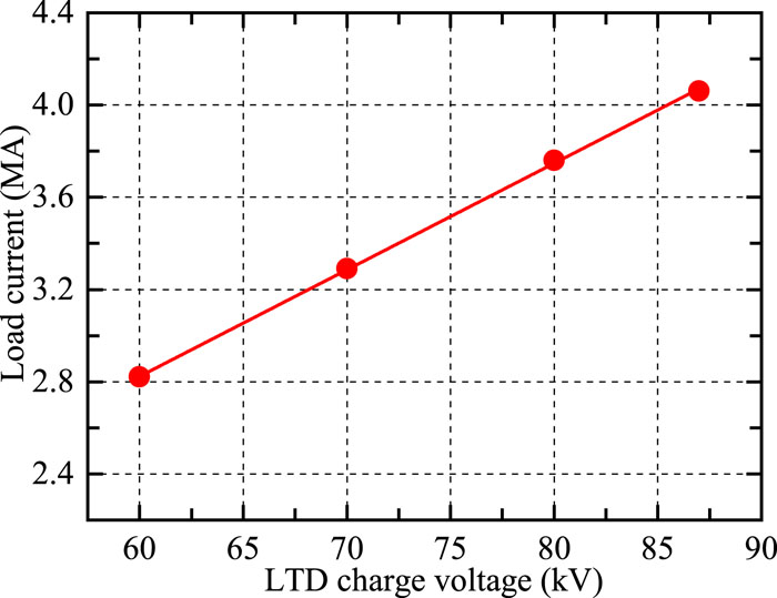 We have designed, assembled, and tested a 4-MA, 60-ns fast linear transformer driver (LTD), which is the first operating generator featuring multiple LTD modules connected in parallel. The LTD-based accelerator comprises six modules in parallel, each of which has ten-stage cavities stacked in series. The six LTD modules are connected to a water tank of diameter 6 m via a 3-m-long impedance-matched deionized water-insulated coaxial transmission line. In the water tank, the electrical pulses are transmitted down by six horizontal tri-plate transmission lines. A 2.1-m-diameter two-level vacuum insulator stack is utilized to separate the deionized water region from the vacuum region. In the vacuum, the currents are further transported downstream by a two-level magnetically insulated transmission-line and then converged through four post-hole convolutes. Plasma radiation loads or bremsstrahlung electron beam diodes serve as loads that are expected to generate intense soft X rays or warm X rays. The machine is 3.2 m in height and 22 m in outer diameter, including support systems such as a high-voltage charge supply, magnetic core reset system, trigger system, and support platform for inner stalk installation and maintenance. A total of 1440 individual ±100-kV multi-gap spark switches and 2880 individual 100-kV capacitors are employed in the accelerator. A total of 12 fiber-optic laser-controlled trigger generators combining photoconductive and traditional gas spark switch technologies are used to realize the synchronous discharge of the more than 1000 gas switches. At an LTD charge voltage of ±85 kV, the accelerator stores an initial energy of about 300 kJ and is expected to deliver a current of 3–5 MA into various loads. To date, the LTD facility has shot into a thick-walled aluminum liner load and a reflex triode load. With a thick-walled aluminum liner of inductance 1.81 nH, a current with peak up to 4.1 MA and rise time (10%–90%) of about 60 ns has been achieved. The current transport efficiency from the insulator stack to the liner load approaches 100% during peak times. The LTD accelerator has been used to drive reflex triode loads generating warm X rays with high energy fluence and large radiation area. It has been demonstrated that this LTD is a promising and high-efficiency prime pulsed power source suitable for use in constructing the next generation of large-scale accelerators with currents of tens of megaamperes.